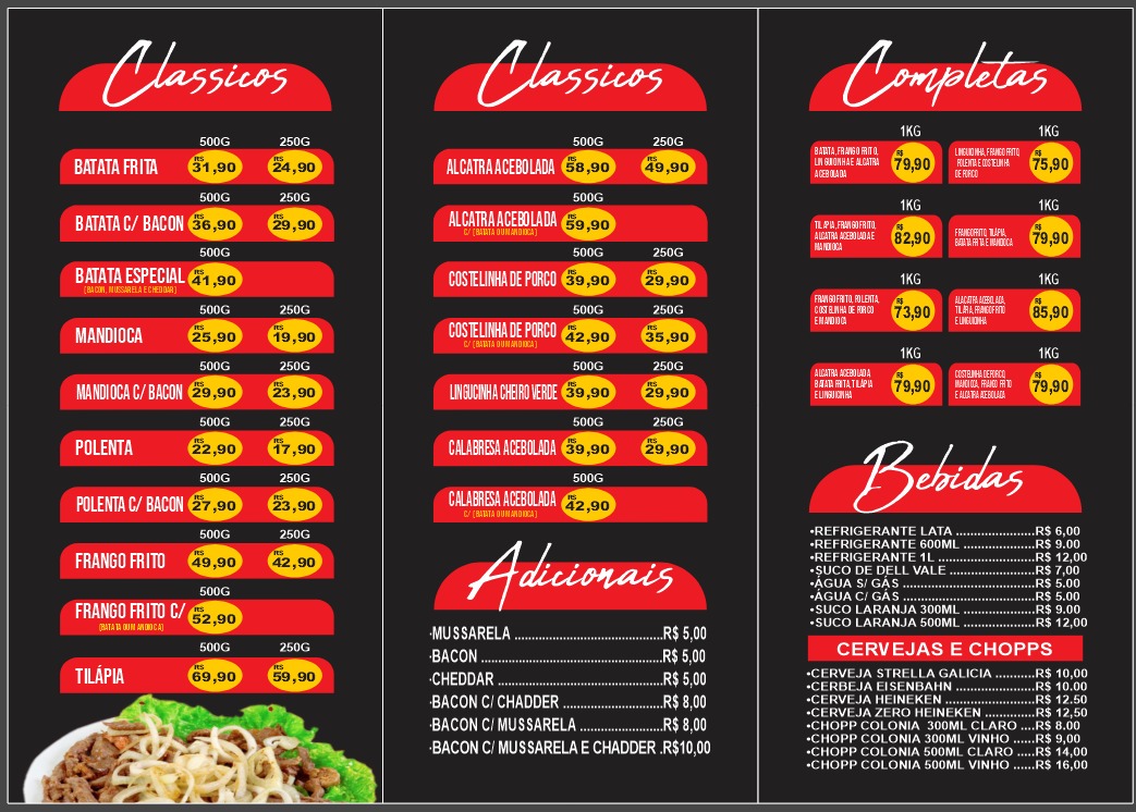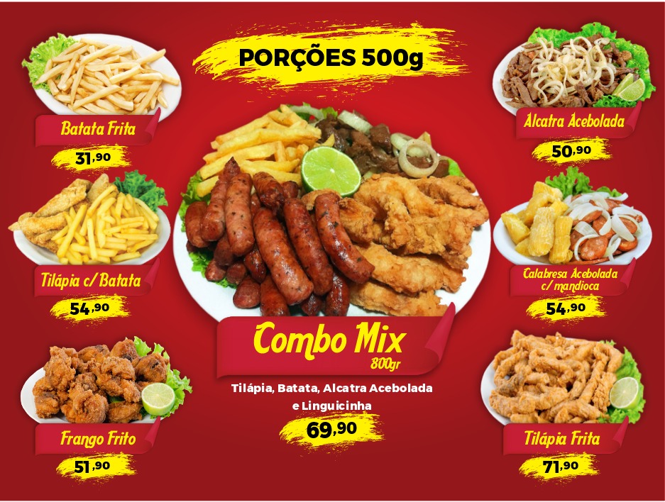 Acompanha: arroz, feijão, batata frita, frango frito, calabresa, ovo frito, pimenta, farofa, molho de alho, sal e palito de dente. (Especifique caso queira tirar algo).