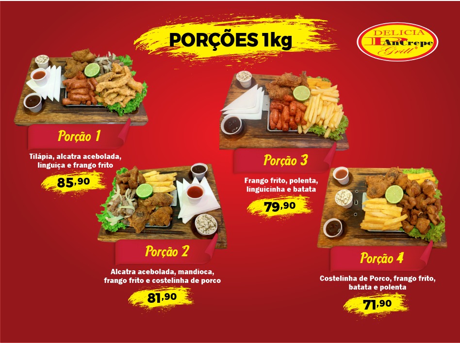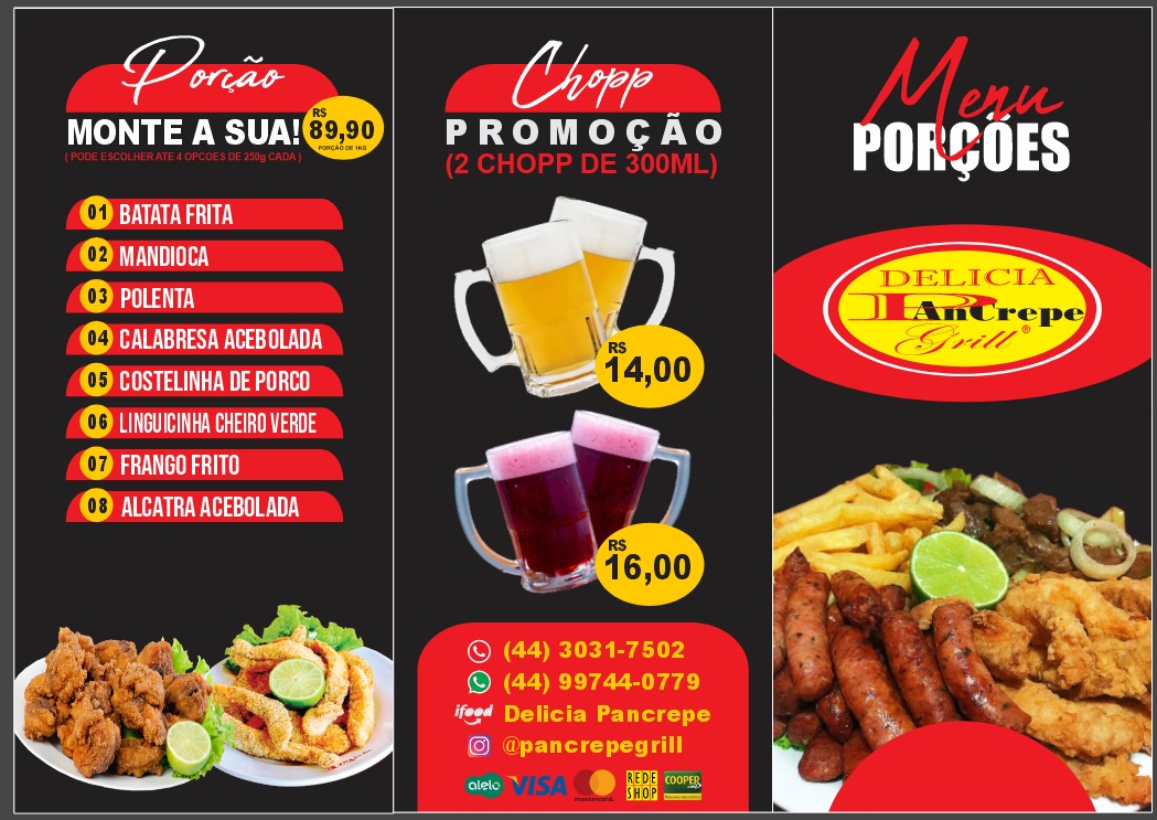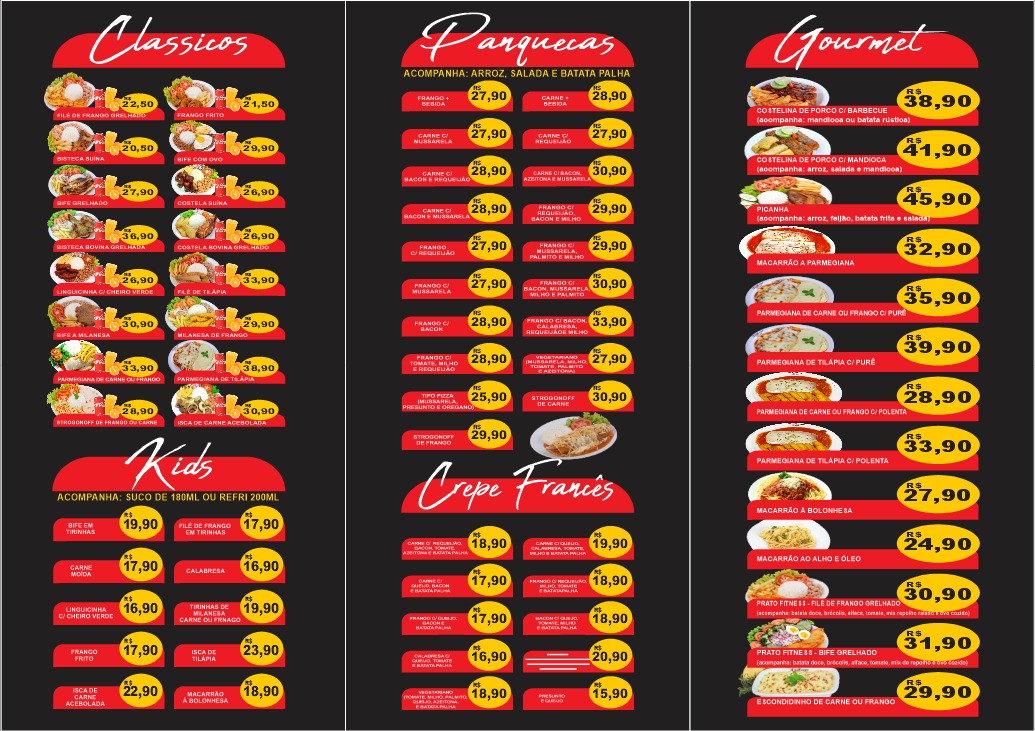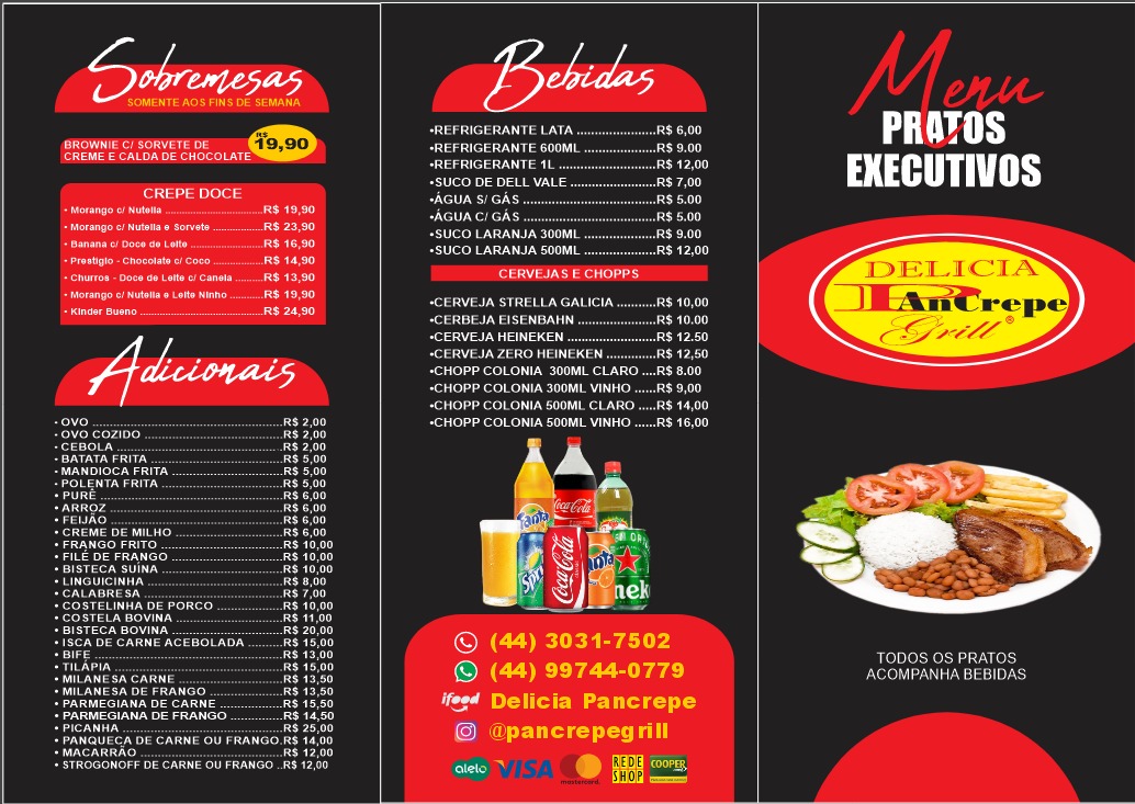In conclusion, the menu at Delícia Pancrepe Grill offers a satisfying variety of hearty and casual options that cater to different tastes, from traditional Brazilian plates to quick, comforting bites. The Filé de Tilápia, Sassami à Milanesa, Costela Bovina Parmegiana, and Costelinha com Mandioca stand out among the executive dishes for their homestyle appeal, while the convenient Marmita 01, Marmita 02, Marmita 03, and Marmita 04 provide practical choices for a filling meal on the go. The omelet selection, including Omelete com Queijo, Bacon e Cebola, Omelete com Cebola e Bacon, Omelete com Cebola e Tomate, and Omelete com Tomate, Presunto, Queijo e Cebola, adds a lighter yet flavorful dimension. Meanwhile, the French crepes such as Crepe Bacon, Crepe Calabresa, Crepe Carne com Queijo, Crepe Frango com Bacon, and Crepe Frango com Requeijão bring a deliciously indulgent twist to the menu. To complement the food, classic drinks like Coca-Cola 1lt, Coca-Cola 350ml, Fanta 350ml, Sprite 350ml, and Coca-Cola 600ml are available, rounding out a menu that feels both diverse and approachable, even though specific prices are not listed.