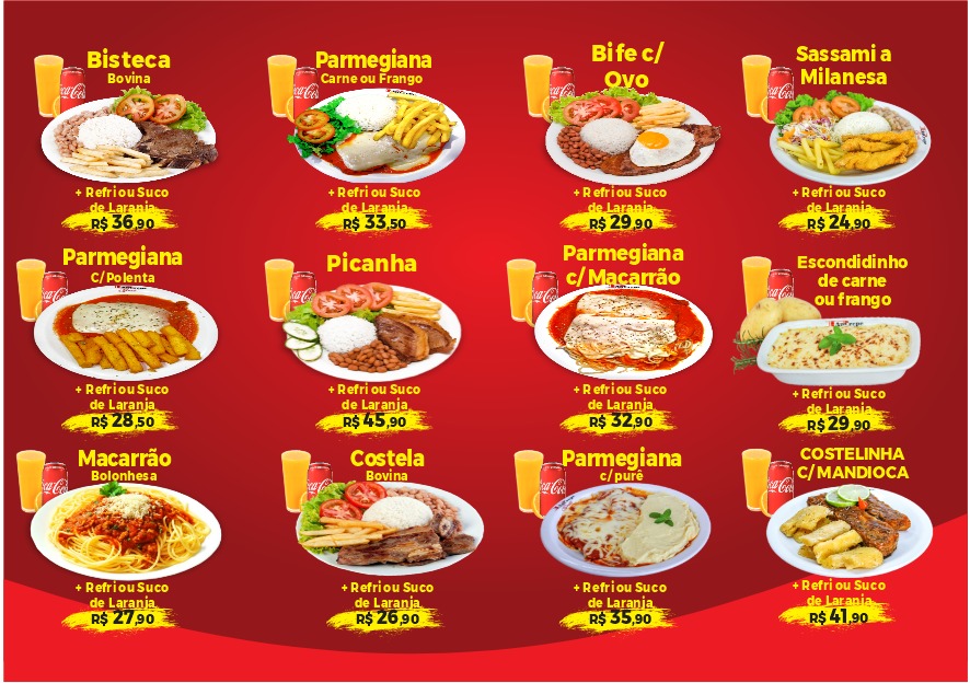 Acompanha: arroz, feijão, batata frita, linguiça suína, filé de frango grelhado, macarrão à bolonhesa, farofa, molho de alho, sal e palito de dente. (Especifique caso queira tirar algo).